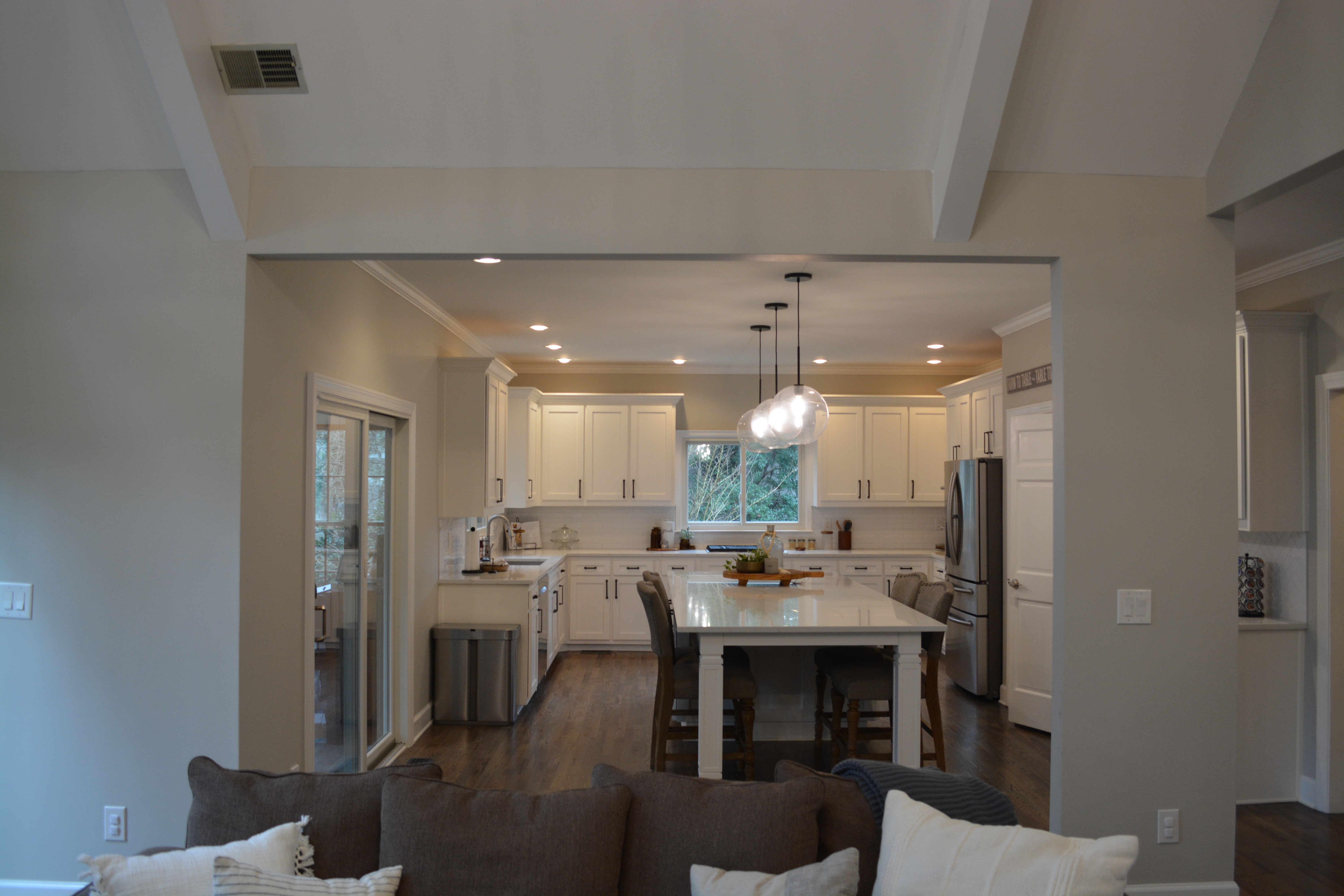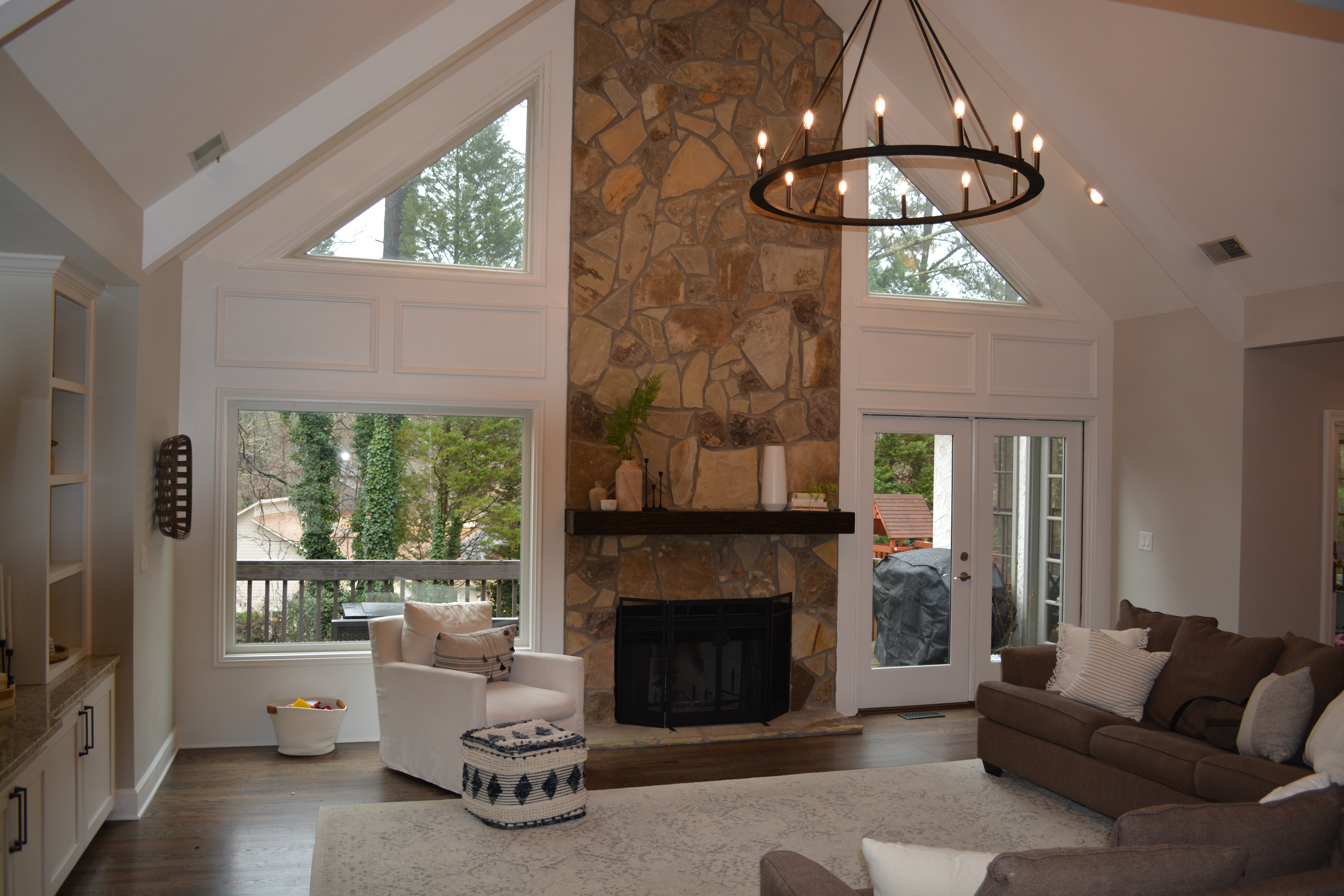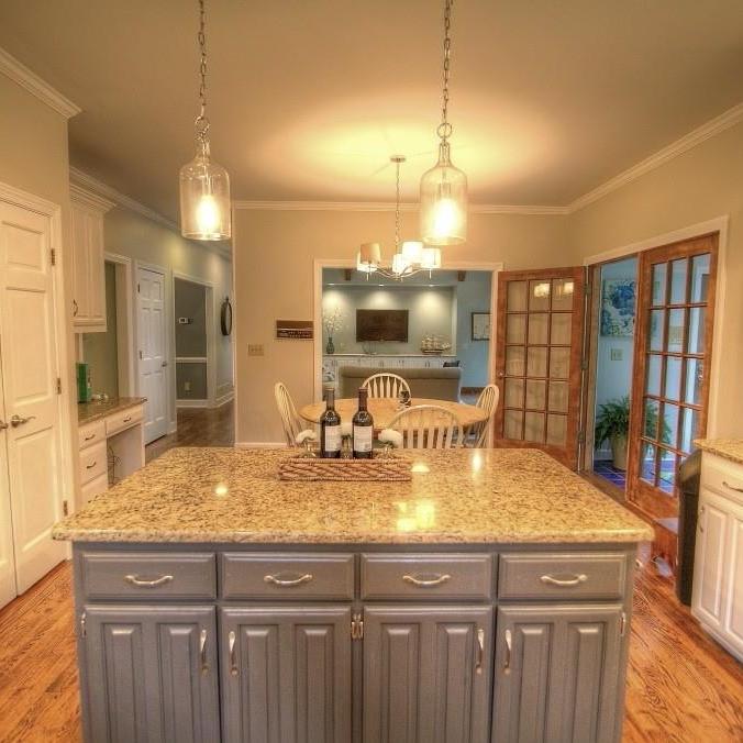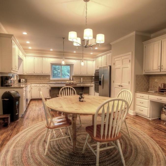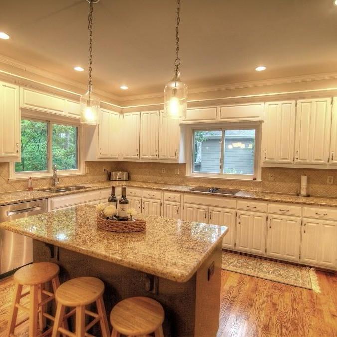 We loved working on this remodel in Roswell. We raised the floor in the living room to match the rest of the main floor living areas. We also took out one of the double doors leading to the back deck and replaced it with a window. The kitchen got a complete facelift and a much larger island. We did some work on an upstairs bedroom as well as the banisters in the whole house.