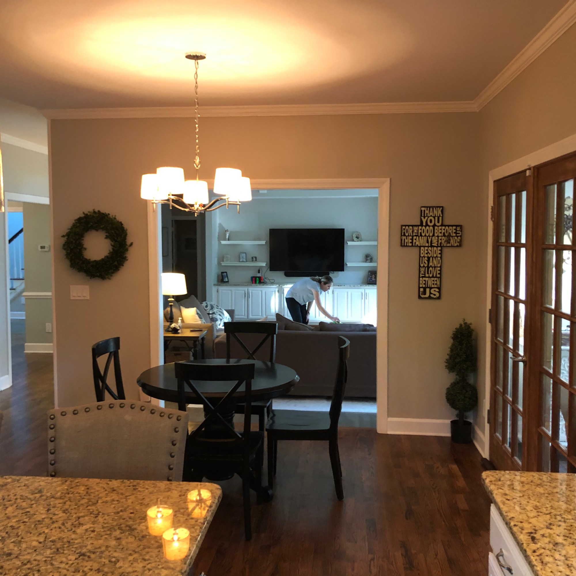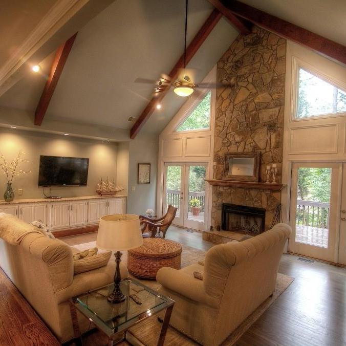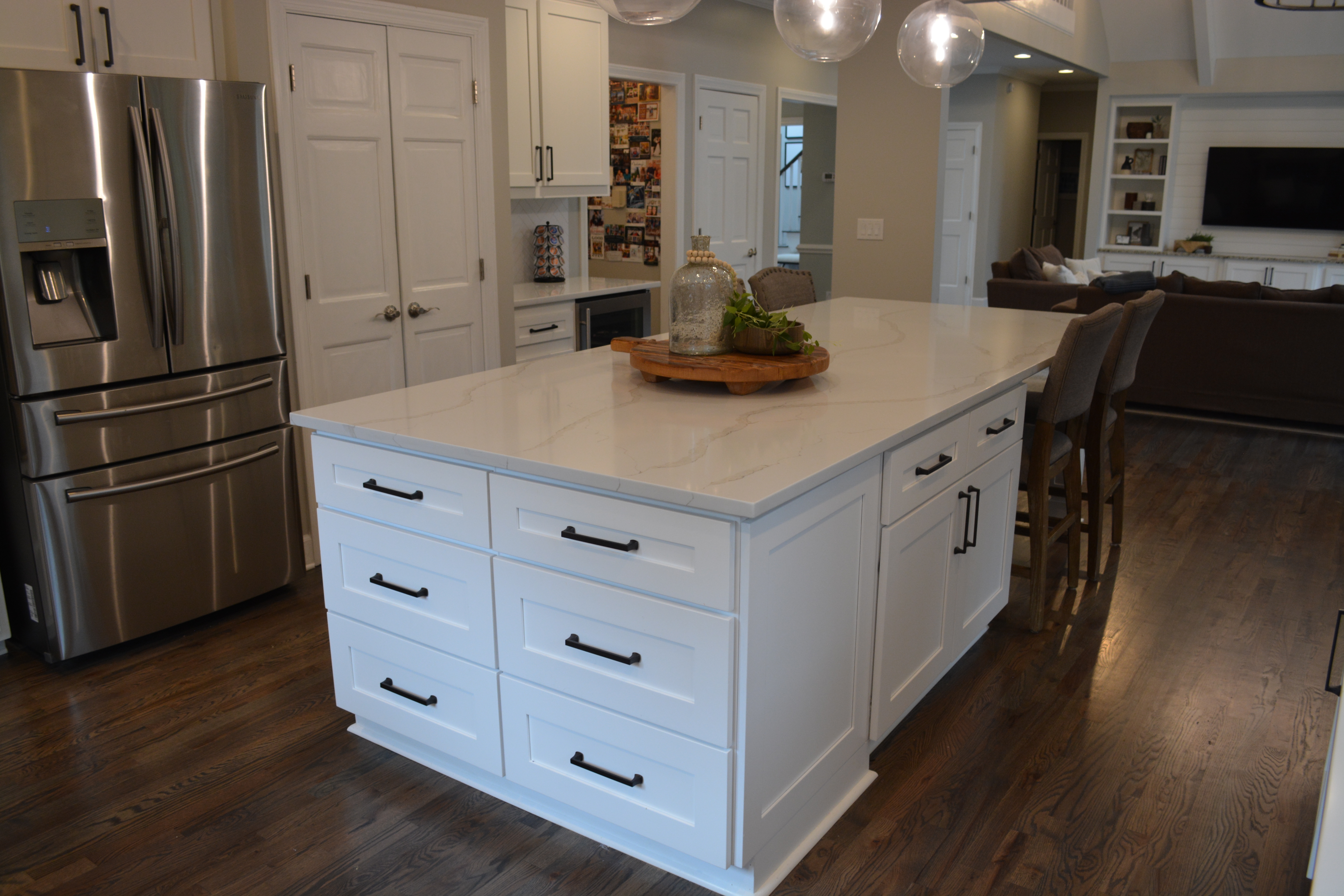 We loved working on this remodel in Roswell. We raised the floor in the living room to match the rest of the main floor living areas. We also took out one of the double doors leading to the back deck and replaced it with a window. The kitchen got a complete facelift and a much larger island. We did some work on an upstairs bedroom as well as the banisters in the whole house.